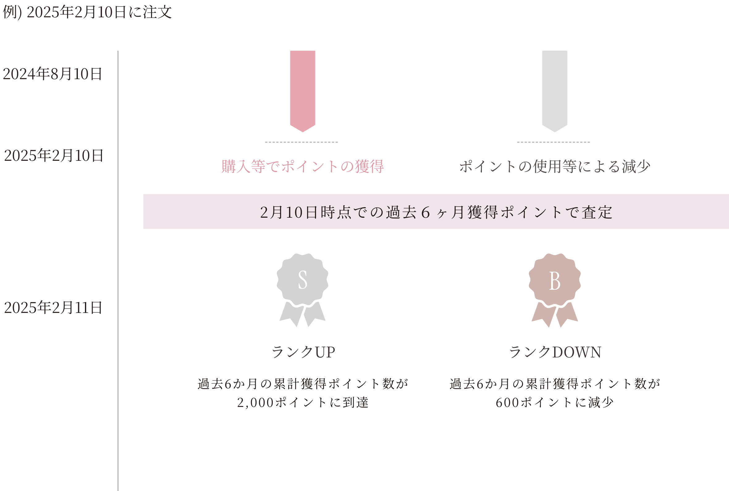 (例①:本日の買い物で過去6か月の累計獲得ポイント数が2,000ポイントに到達→翌日からゴールド会員にランクアップ、例②:本日に過去6か月の累計獲得ポイント数が600ポイントに減少→翌日からシルバー会員にランクダウン)